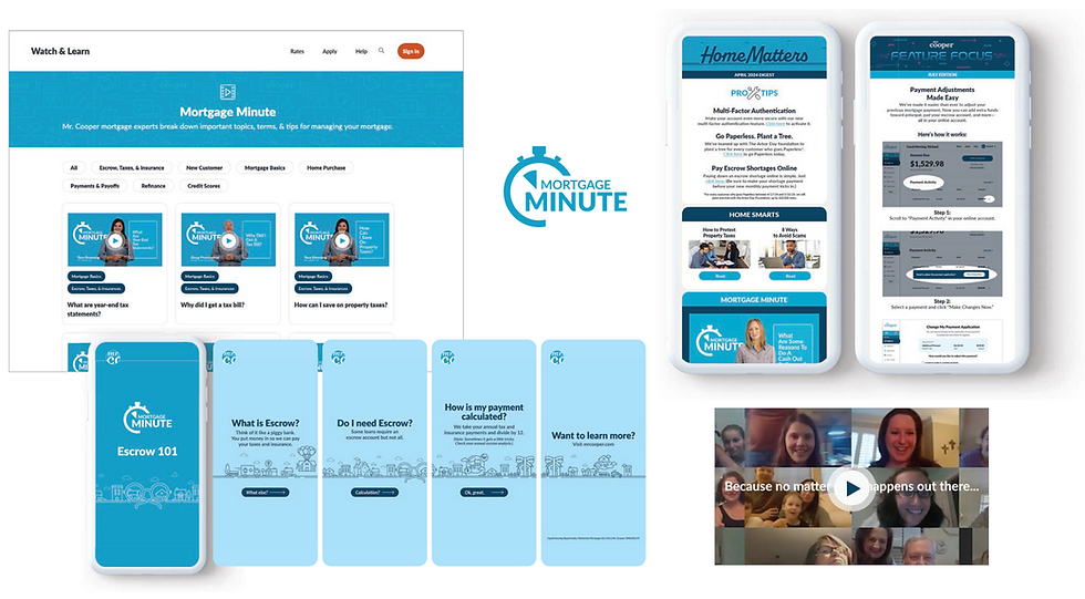 Beyond Mr. Cooper, I led creative strategy and execution for multiple Mr. Cooper Group brands and white labels including Xome, Rushmore, RightPath, TD Bank, and USAA. My work has been recognized with 12 industry awards for creative excellence and effective communications.